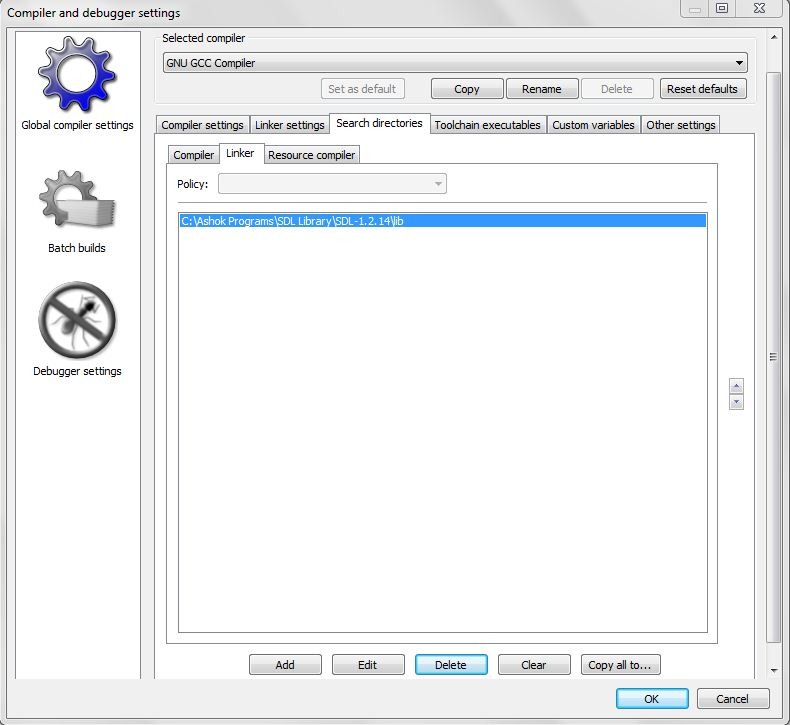 - Go to Setting->Compiler and Debugger and go to Tab Search Directories so that codeblocks will search for the include folder or library folder in the location that we have set.