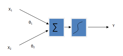 Linear regression is one of the Generalized Linear Model (GLM). In linear model, the output variable (i.e. dependent variable) is assumed to be a linear combination of input variables (i.e. independent variables). The output variable takes continuous values. Here the input and output variables both are expected to be numeric. The figure below shows the simple representation of a linear regression processor. X1 and X2 are input variables and Y is the output variable. The learning goal is to find out the hidden parameters θ(also called weights)