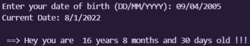 printf("\n ==> Hey you are %d years %d months and %d days old !!!\n", year, month, days);